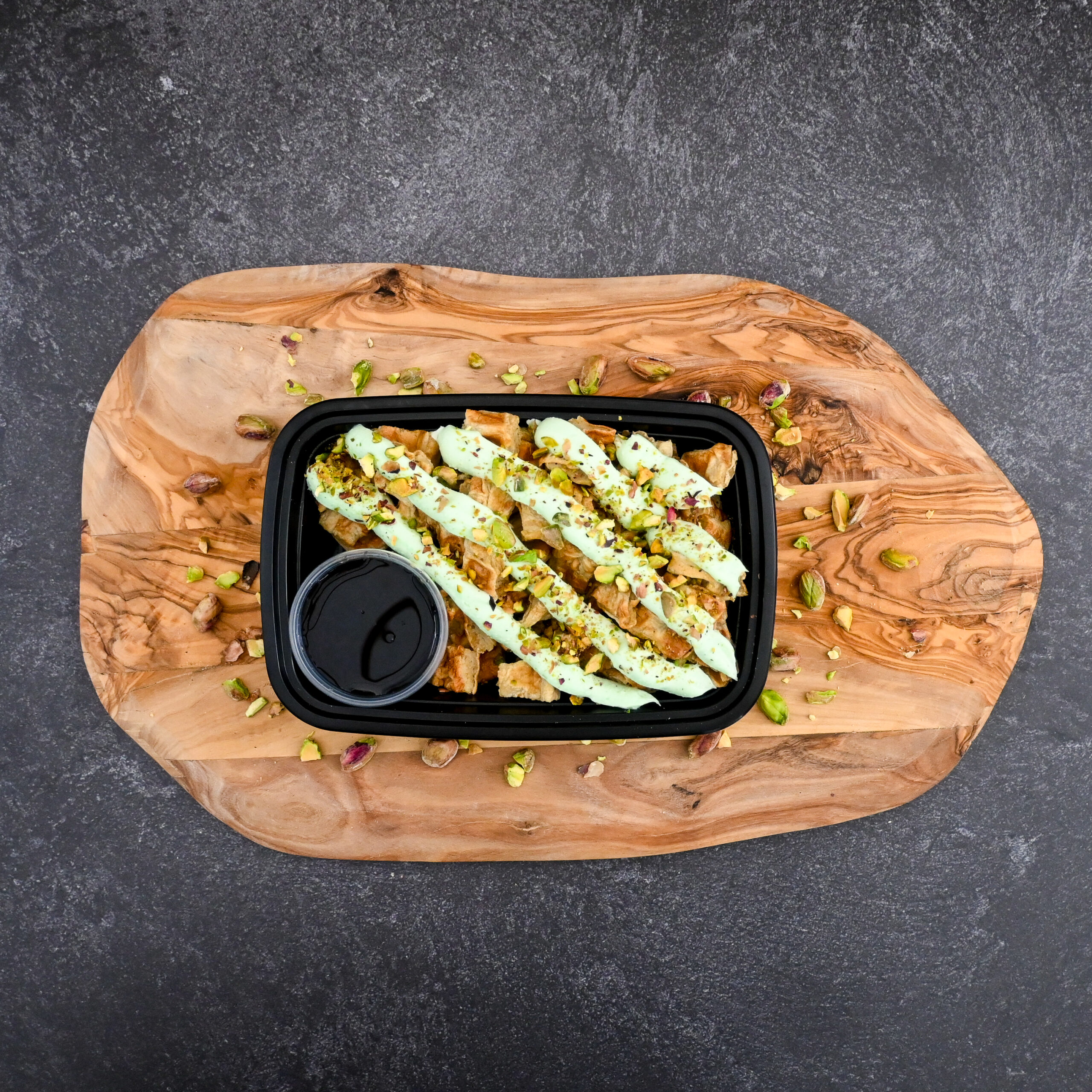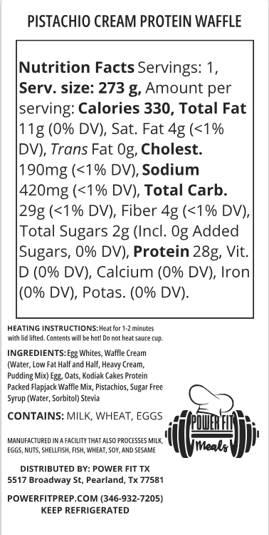 OUR PROTEIN WAFFLES SERVED WITH PISTACHIO CREAM AND CRUNCHY PISTACHIOS PIECES ON TOP!