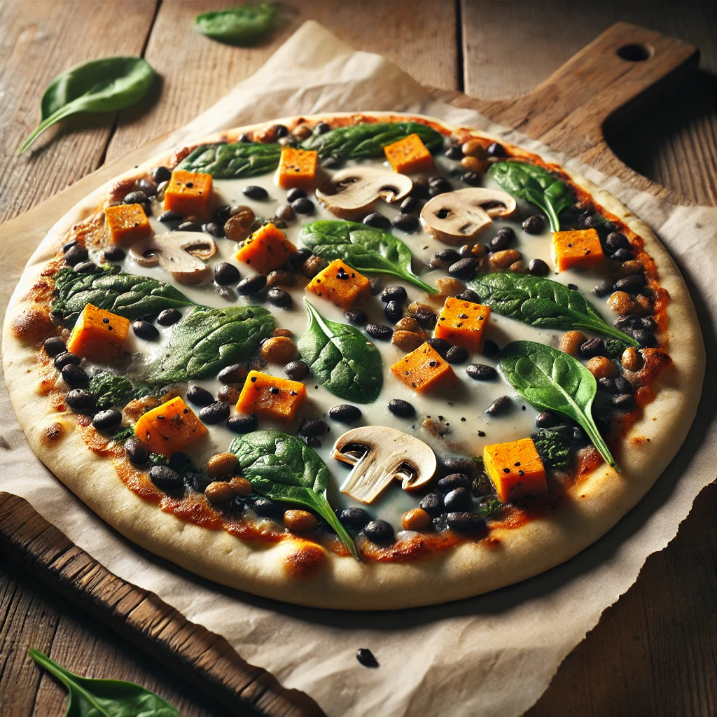 YUMMY PITA STUFFED WITH BLACK BEANS, SWEET POTATOES, MUSHROOMS, SPINACH, AND VEGAN CHEESE!