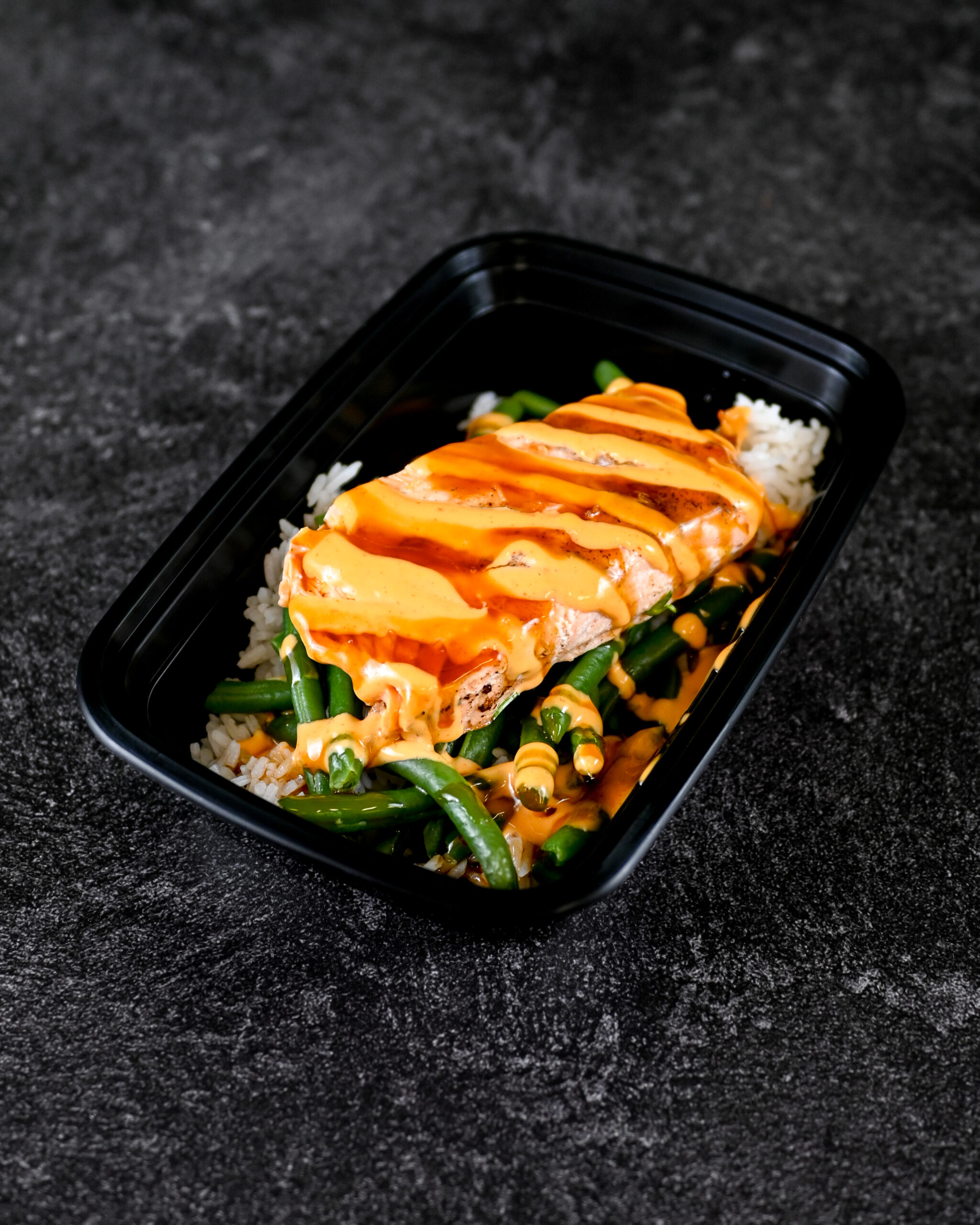 OUR DELICIOUS SALMON SERVED WITH RICE, GREEN BEANS, TOPPED WITH TERIYAKI/SIRACHA MAYO NORE!