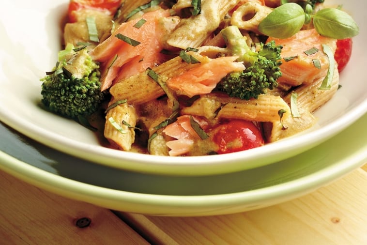 HAVE IT HOT OR COLD! PENNE PASTA TOSSED IN OLIVE OIL, PARMESAN CHEESE, MIXED WITH SUMMER VEGGIES, AND GRILLED SALMON!
