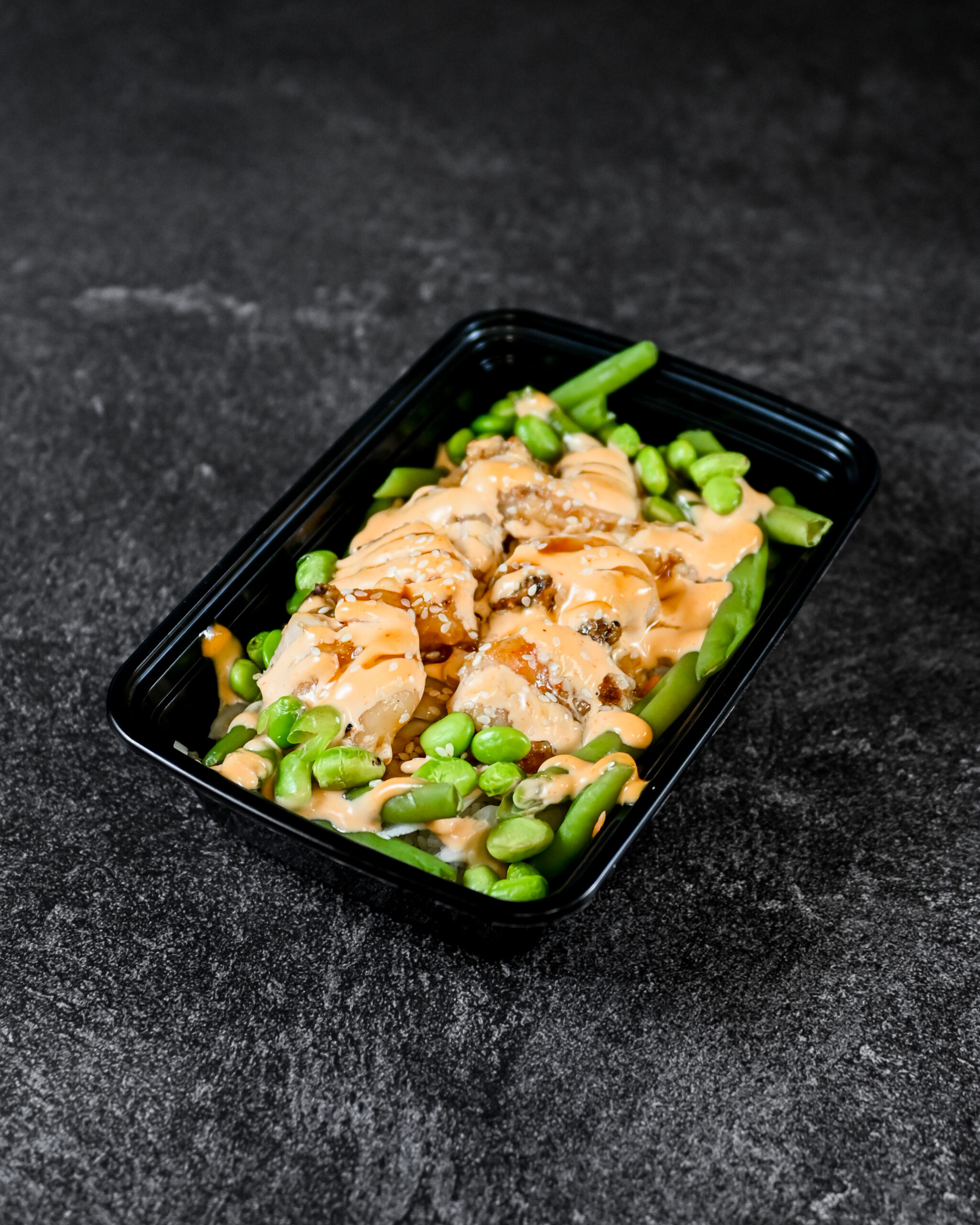 A TWIST ON ONE OF OUR MOST POPULAR DISHES. SHRIMP SERVED WITH RICE, CABBAGE MIX, GREEN BEANS, AND EDAMAME TOPPED WITH SRIRACHA MAYO AND TERIYAKI SAUCE!