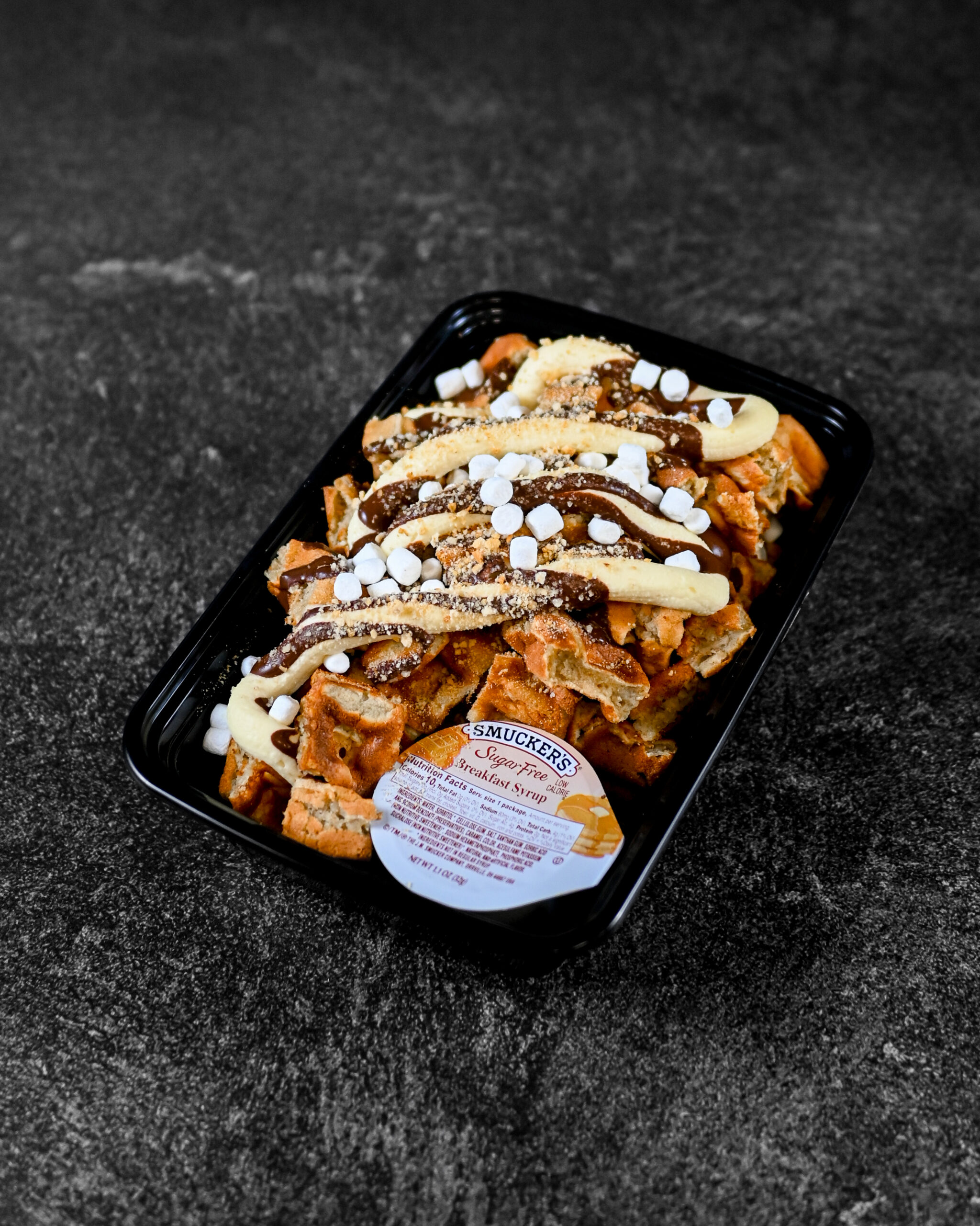 OUR FLUFFY PROTEIN WAFFLE SERVED WITH CHOCOLATE, MARSHMALLOWS, GRAHAM CRUST DUST AND SUGAR FREE SYRUP