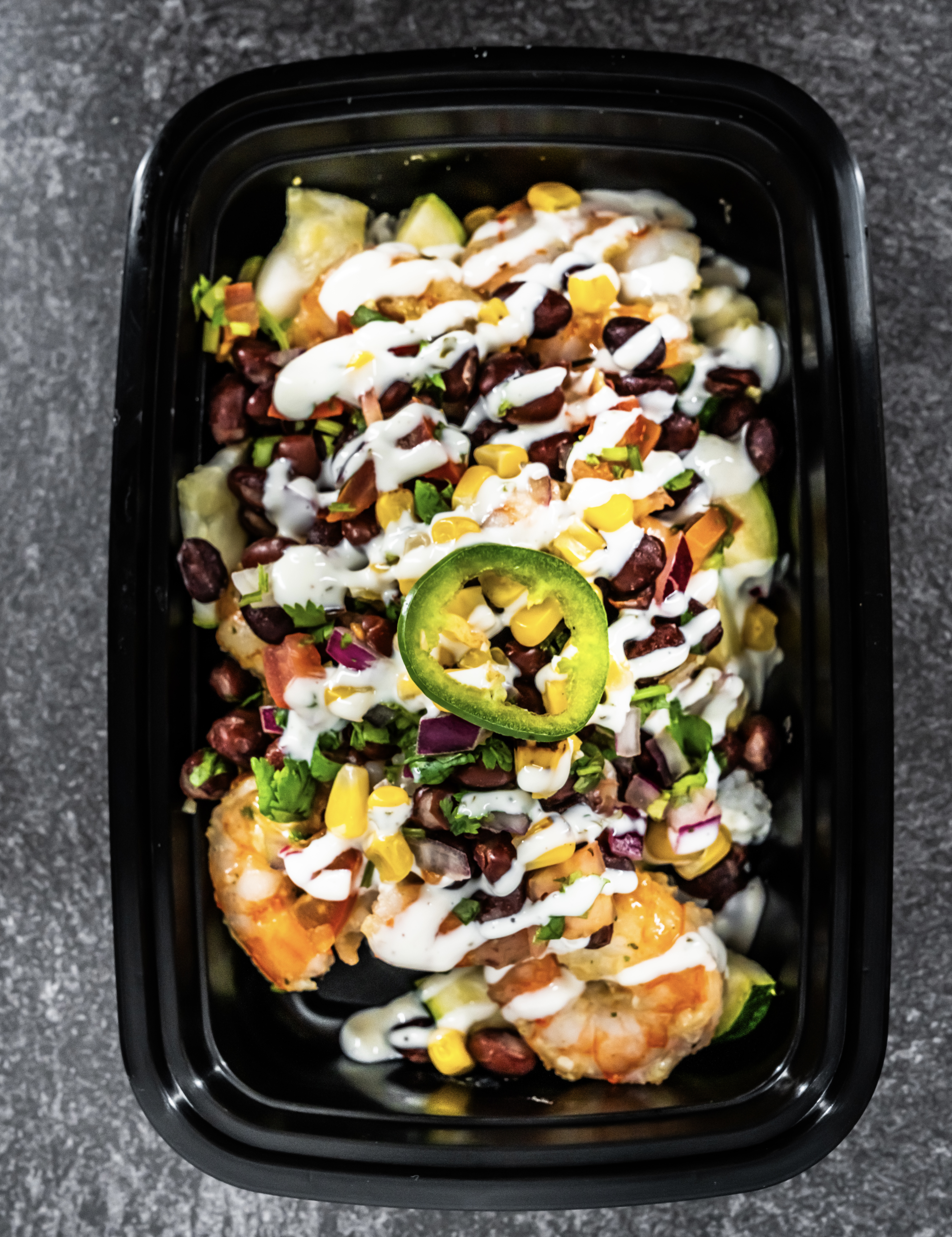 DELICIOUS TACO SHRIMP SERVED ON A BED OF RICE, TOPPED WITH BLACK BEAN CORN SALSA, ZUCHINNI, AND TOPPED WITH A CREAMY RANCH DRIZZLE!