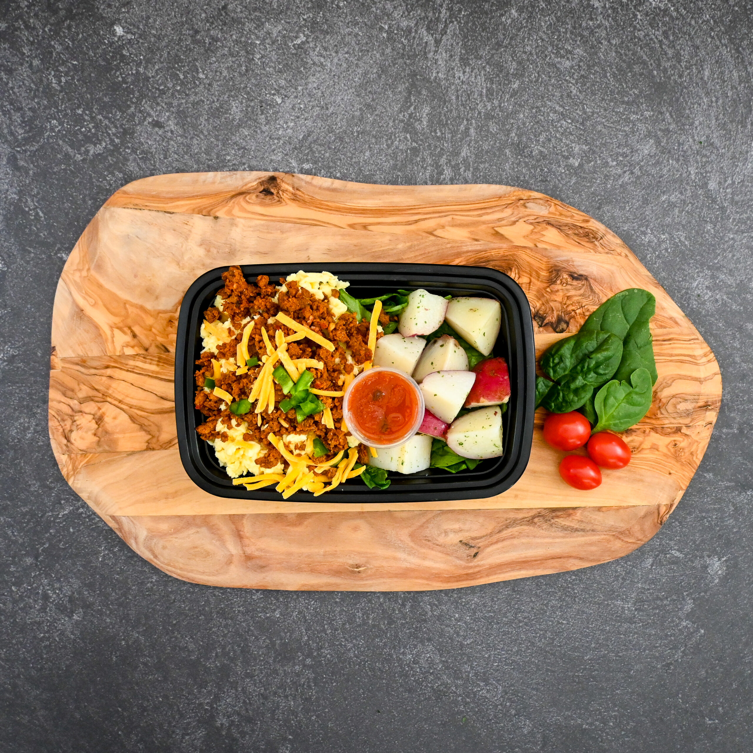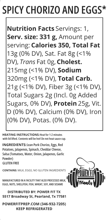 FRESH EGGS WITH LEAN CHORIZO, JALAPENOS, CHEDDAR, SPINACH, RED POTATOES, CHEDDAR AND SALSA!