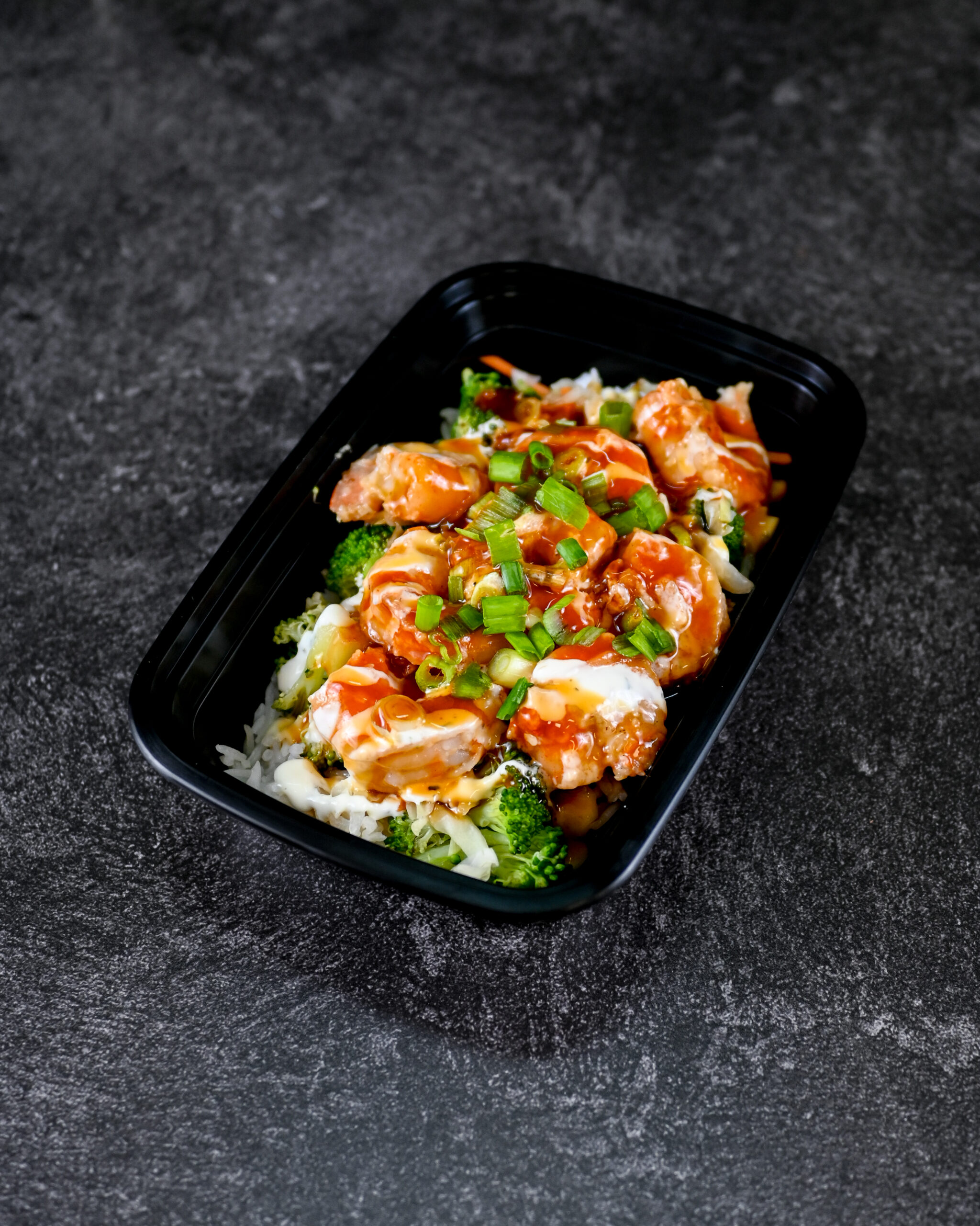 PLUMP SHRIMP SERVED WITH RICE, BROCCOLI, CARROTS AND CABBAGE TOPPED WITH SPICY TERIYAKI SAUCE WITH A RANCH DRIZZLE 🍽️✨