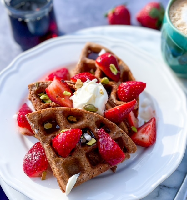 OUR FLUFFY PROTEIN WAFFLES TOPPED WITH PROTEIN CHEESECAKE SAUCE AND SUGAR FREE STRAWBERRY JAM!