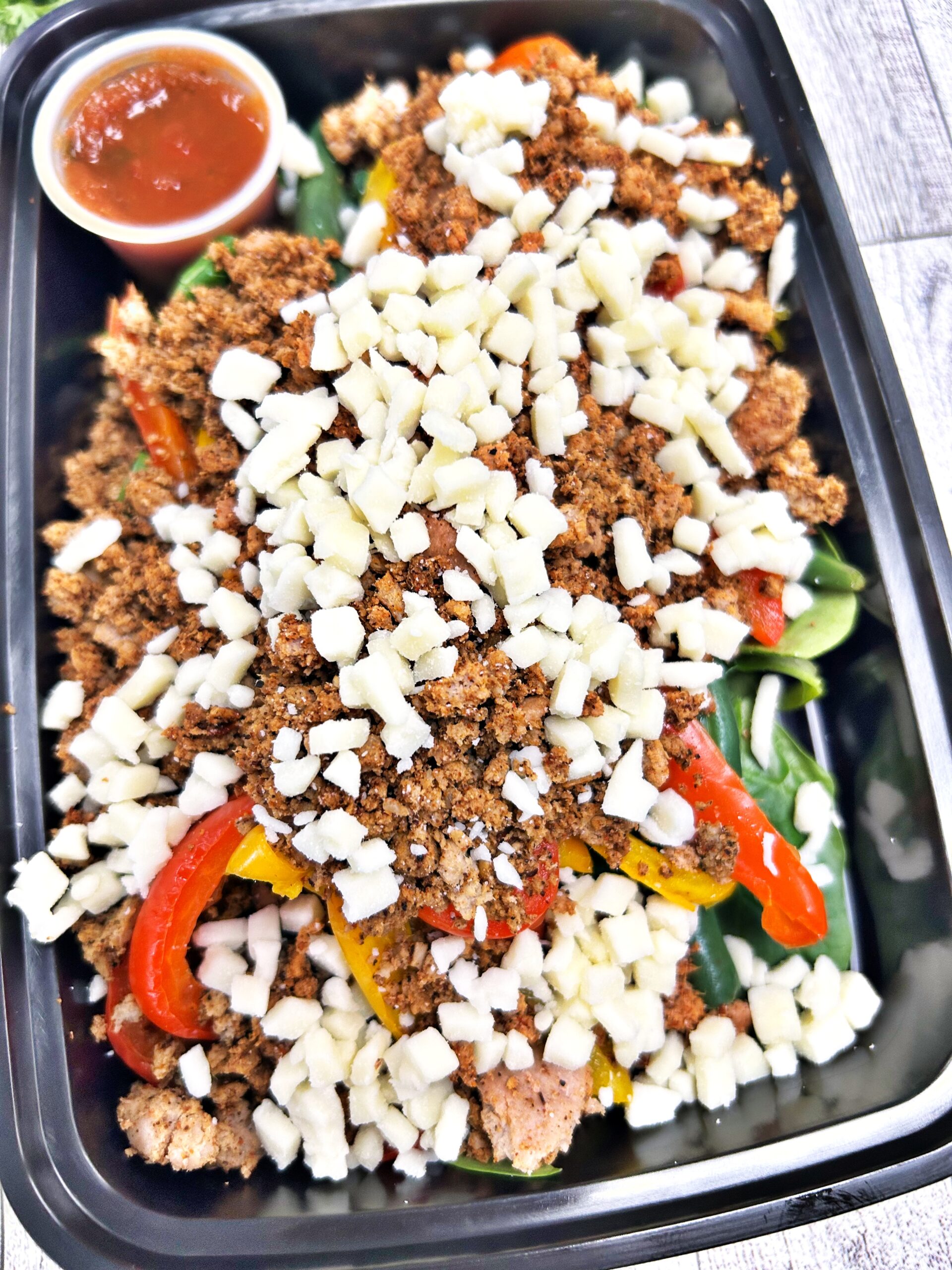 Taco flavored turkey, cheddar, mozzarella, spinach, bell peppers, zucchini, and salsa