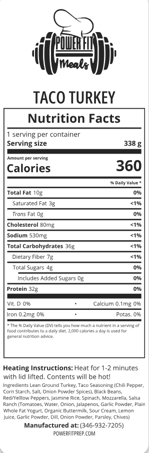 Taco flavored lean ground turkey with black beans, jasmine rice, spinach, salsa, bell peppers, and mozzarella