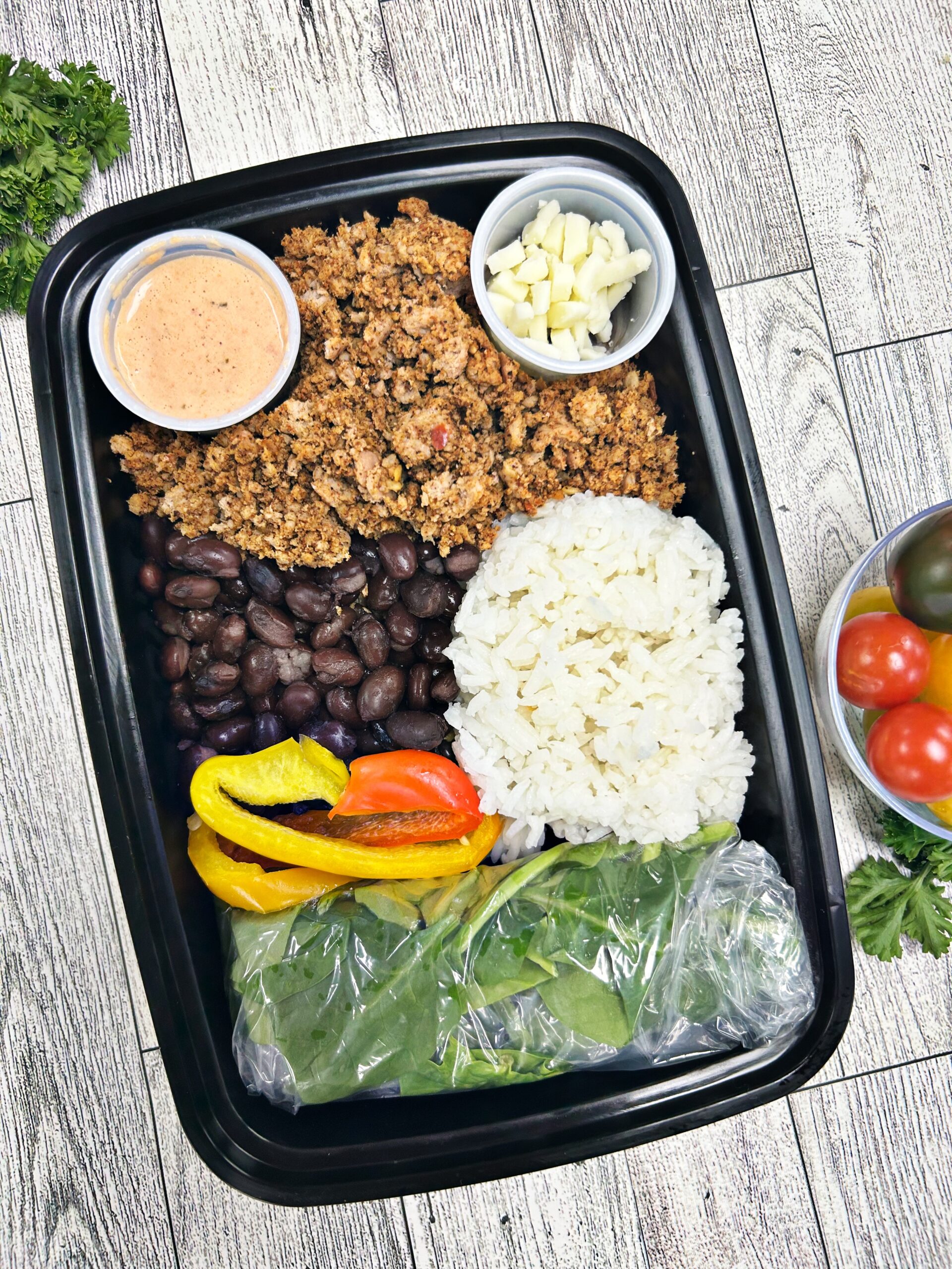 Taco flavored turkey with black beans, jasmine rice, spinach, salsa, bell peppers, and mozzarella