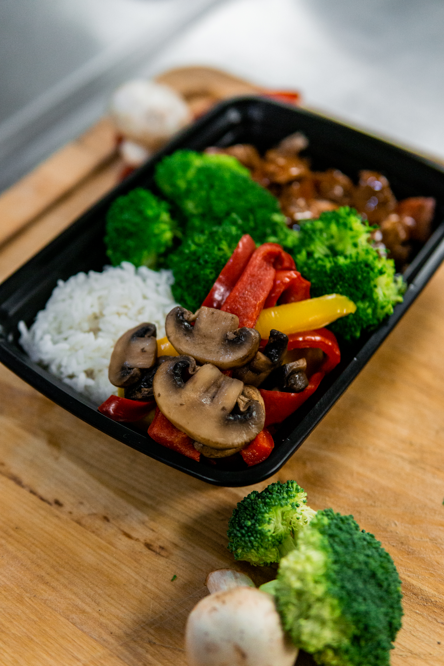 LEAN GRASS FED BEEF WITH TERIYAKI SAUCE, JASMINE RICE, BROCCOLI, RED/YELLOW BELL PEPPERS, AND MUSHROOMS!