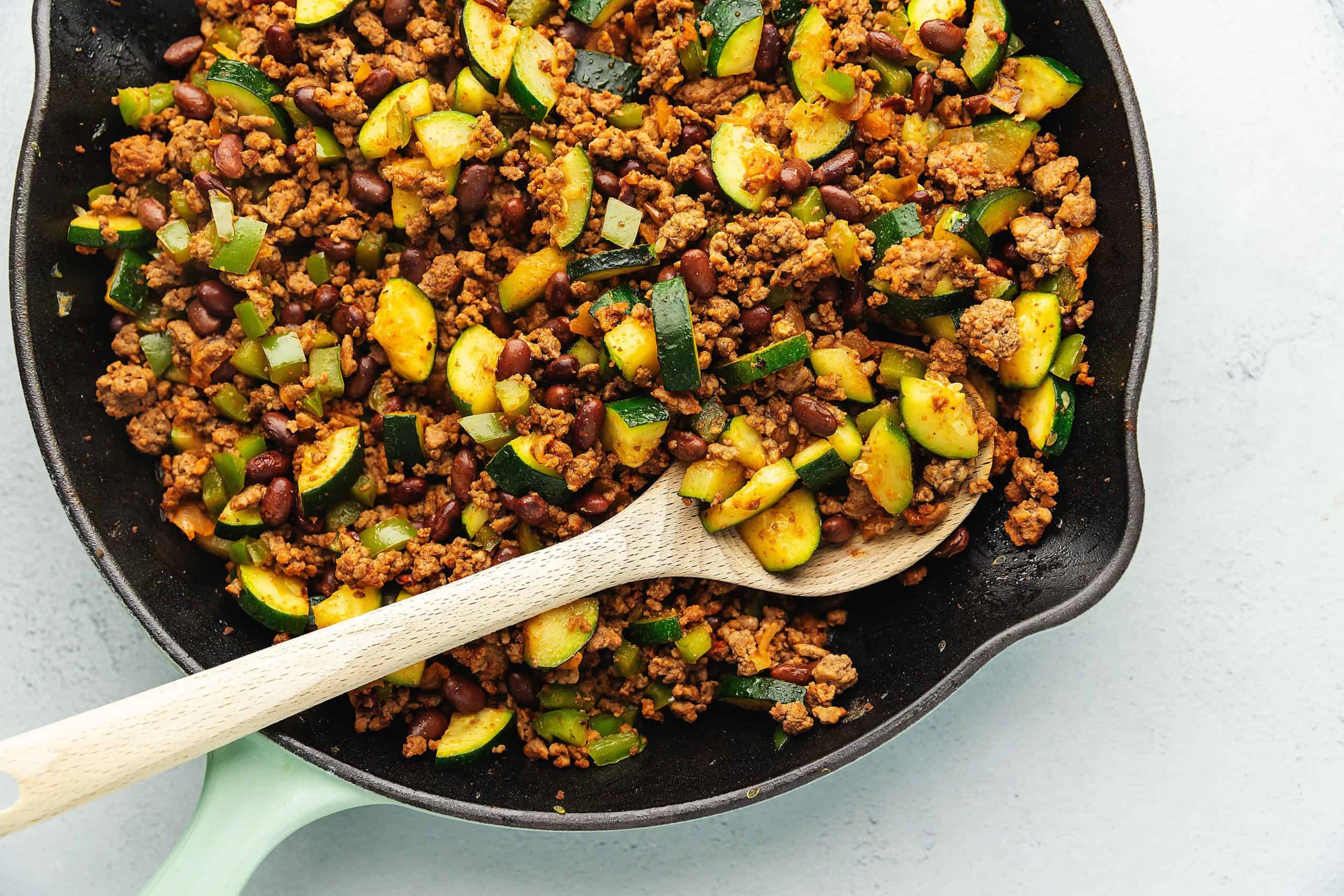 BEEF AND ZUCCHINI COOKED IN A SMOKY TOMATO SAUCE SERVED WITH RICE, CORN, CILANTRO, AND COTIJA CHEESE.