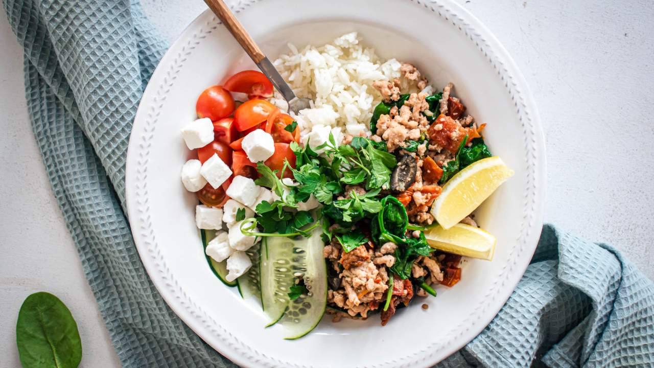 GROUND TURKEY BREAST SERVED WITH JASMINE RICE, ZUCCHINI, BELL PEPPERS, BABY TOMATES, FETA, AND TZAZIKI SAUCE
