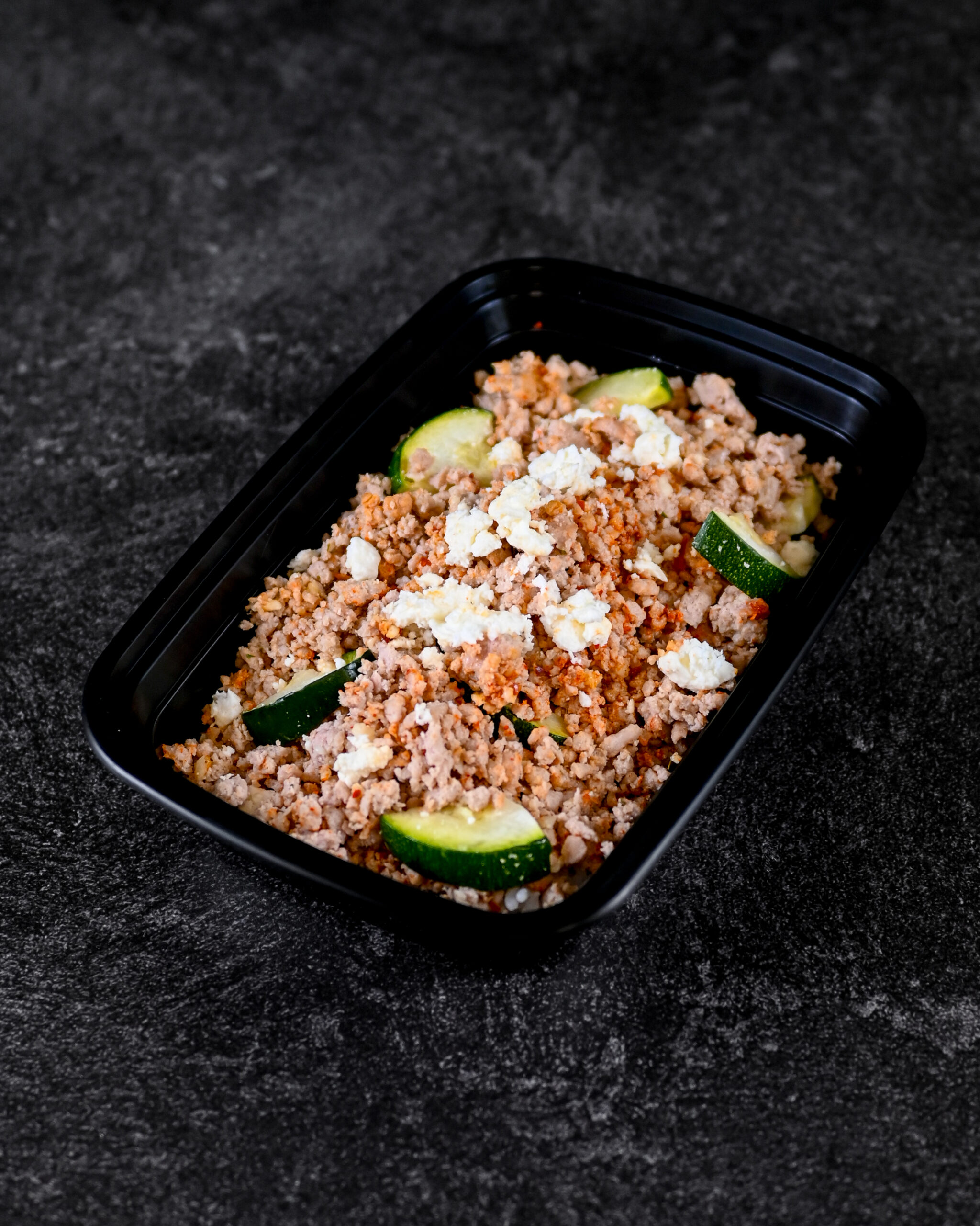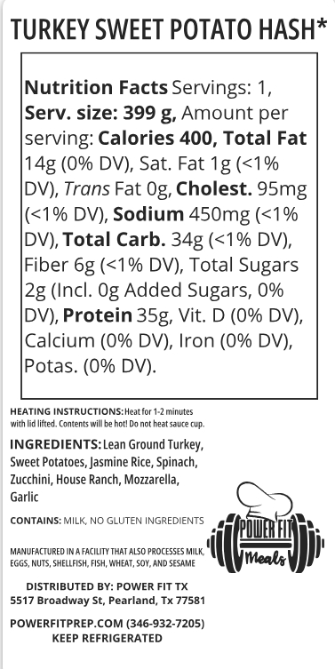 Lean Ground Turkey, Sweet Potatoes, Jasmine Rice, Spinach, Zucchini, House Ranch, Mozzarella, Garlic