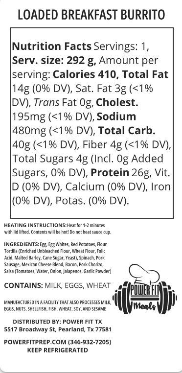 TOP SELLER! THIS BREAKFAST BURRITO IS PACKED WITH PROTEIN! WE MIX IN TURKEY AND PORK SAUSAGE, BACON, CHEESE, POTATOES AND SPINACH. SERVED WITH FRESH SALSA!