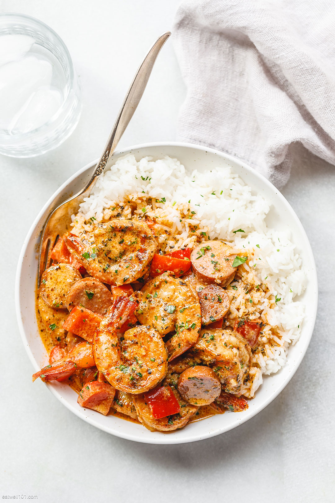 GRILLED SHRIMP AND TURKEY SAUSAGE SERVED WITH RICE, BROCCOLI, PAIRED WITH OUR SIGNATURE GARLIC PARM SAUCE!