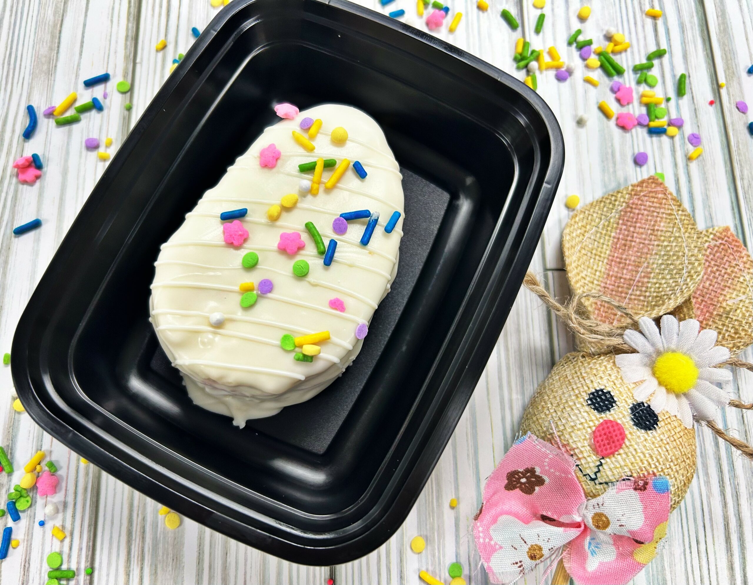 This tasty spring treat is reduced in sugar but full of flavor. A Vanilla cake dipped in a light coating of white candy with a layer of colorful sugar free protein buttercream topped with sprinkles.